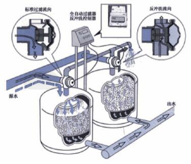 隨著雜質(zhì)在填料層中不斷聚積,內(nèi)部壓頭損失將不斷增大。當(dāng)進(jìn)、出水壓頭損失達(dá)到設(shè)定值時(shí),系統(tǒng)將自動(dòng)激活定壓裝置使其轉(zhuǎn)換至反洗狀態(tài),當(dāng)此臺(tái)反洗結(jié)束,水力閥改變給水方向從而實(shí)現(xiàn)逐臺(tái)反洗,更便于清洗聚積起來(lái)的雜質(zhì)。