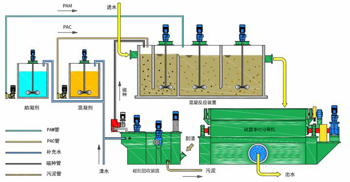 工藝流程簡述 (1)污水泵從取水點抽水進(jìn)入混凝反應(yīng)器,與一定濃度磁性物質(zhì)混合均勻;